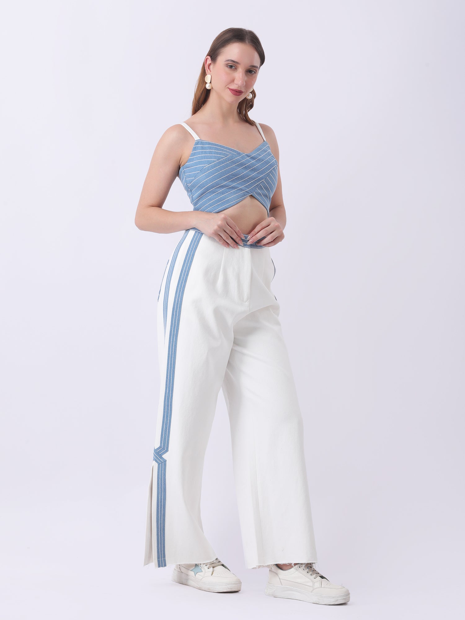 This Gaiia co-ord set perfectly captures a spirit of fresh, contemporary style. The design cleverly plays with contrasting panels, pairing a chic striped wrap top with crisp, solid trousers that feature matching striped details for a cohesive and intentional look. The flattering wrap silhouette of the top and the relaxed wide-leg cut of the pants make this ensemble both stylish and incredibly comfortable. Ideal for a sun-drenched getaway or a stylish city brunch, this set embodies the Gaiia brand's flair for creating youthful, polished, and playful fashion.