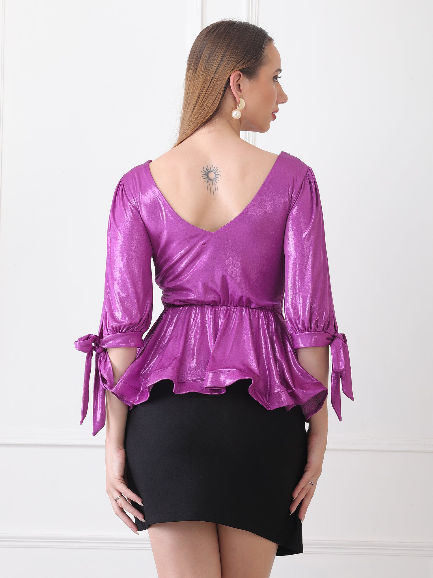 Striking and sophisticated, this Gaiia metallic violet peplum top embodies the brand’s fearless approach to statement dressing. The cross-wrap V-neckline sculpts the upper frame, while the voluminous sleeves and tied cuffs introduce a romantic touch. Silver shoulder accents add modern edge, and the peplum flare creates a perfectly balanced silhouette. Designed for the confident Gaiia woman, this piece transitions effortlessly from upscale dinners to evening celebrations, commanding attention with every movement.