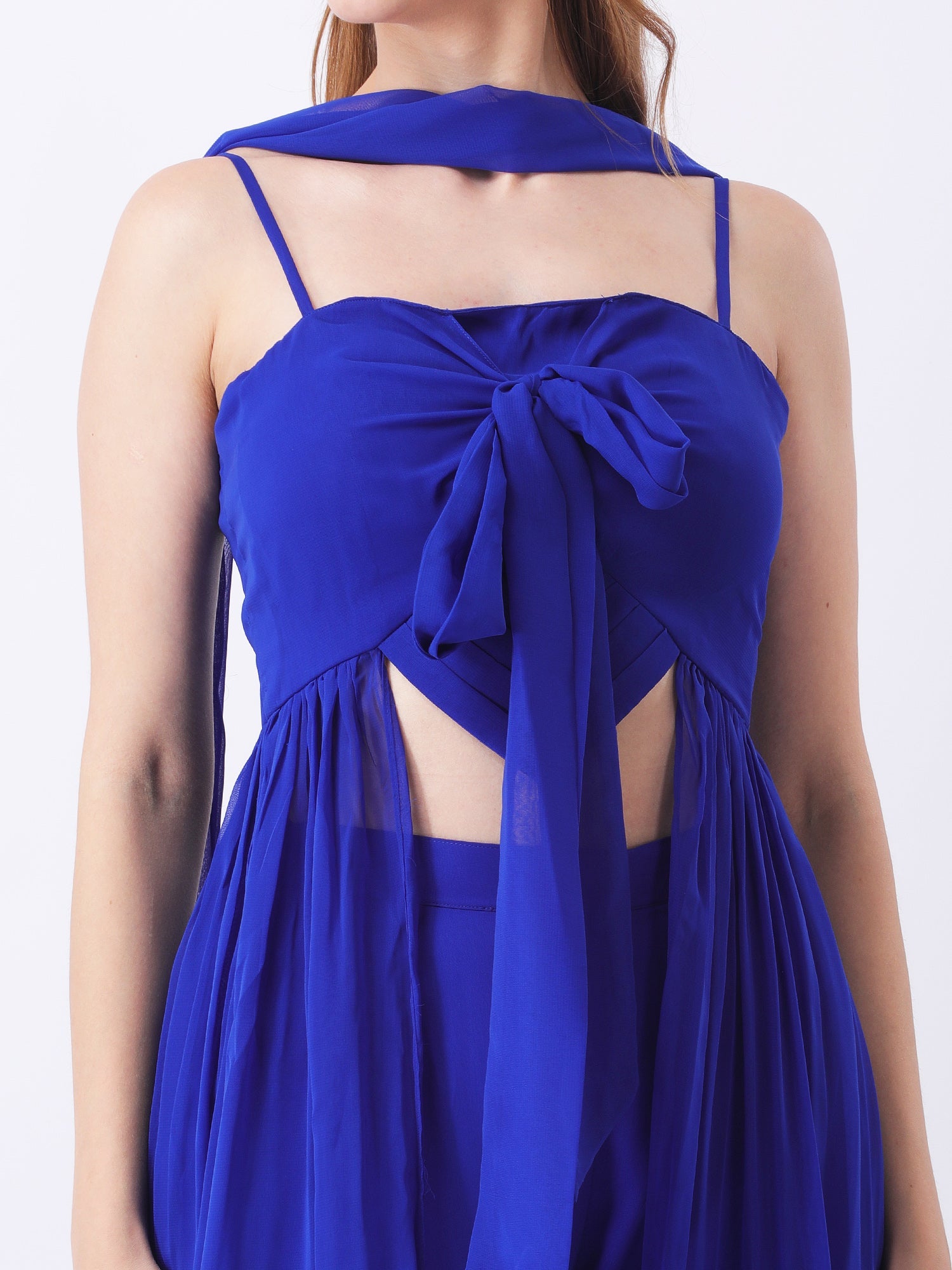 This Gaiia ensemble is a masterclass in modern, layered elegance. The design brilliantly fuses the chic structure of a two-piece set with the ethereal grace of a flowing gown. The playful tie-front top serves as a stylish anchor for the dramatic sheer overlay, which creates breathtaking movement with every step. Grounded by sleek, tailored trousers, the look is both unique and exquisitely balanced. The addition of a versatile matching scarf allows for personalized styling, making this set a standout choice for weddings, galas, or any special occasion. It's a true reflection of the Gaiia brand's commitment to creating innovative, sophisticated, and unforgettable fashion.