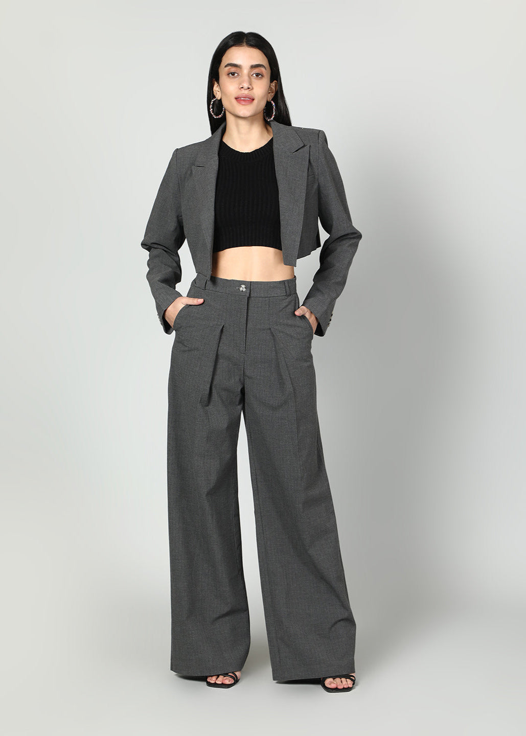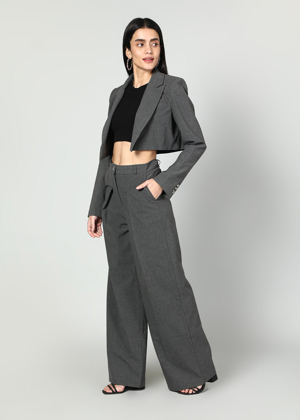 This versatile two-piece set features a structured cropped blazer and flowy wide leg trousers, perfect for a polished and modern look. Made from high-quality materials, it offers both style and comfort. Elevate your wardrobe with this must-have set.