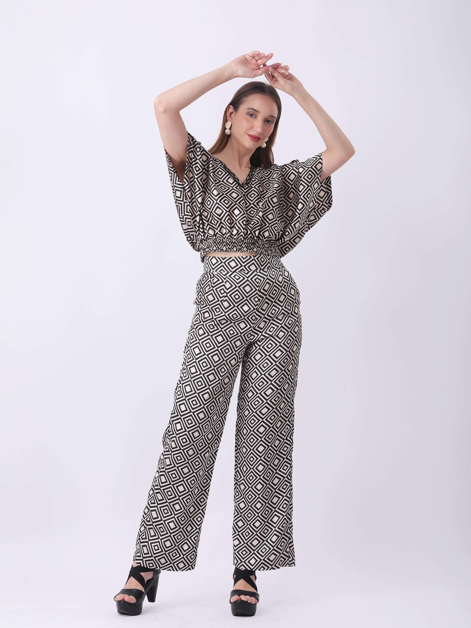 This Gaiia co-ords set is a stunning blend of 70s-inspired glamour and contemporary ease. The bold, all-over geometric print creates an instant visual impact, while the carefully designed silhouette ensures a flattering fit. The blouson-style top, complete with elegant flutter sleeves and a cinched waist, flows seamlessly into dramatic wide-leg trousers, creating a long and graceful line. This single piece is an entire outfit, perfect for making a sophisticated statement at a dinner party or a resort evening. It embodies the Gaiia brand's flair for creating fashion that is both effortlessly chic and unforgettably bold.