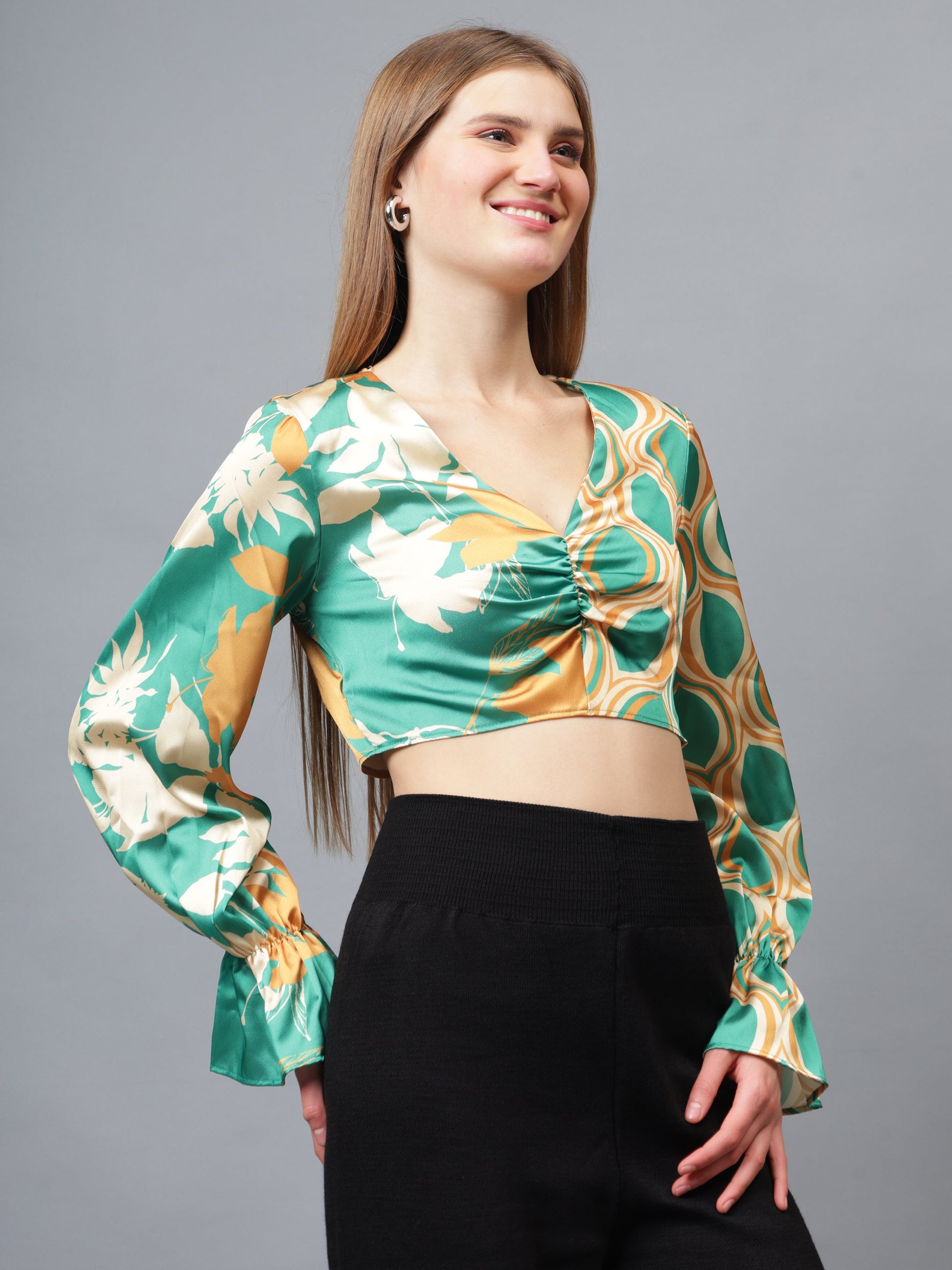 Gaiia Half & Half Printed Satin Crop Top - Green