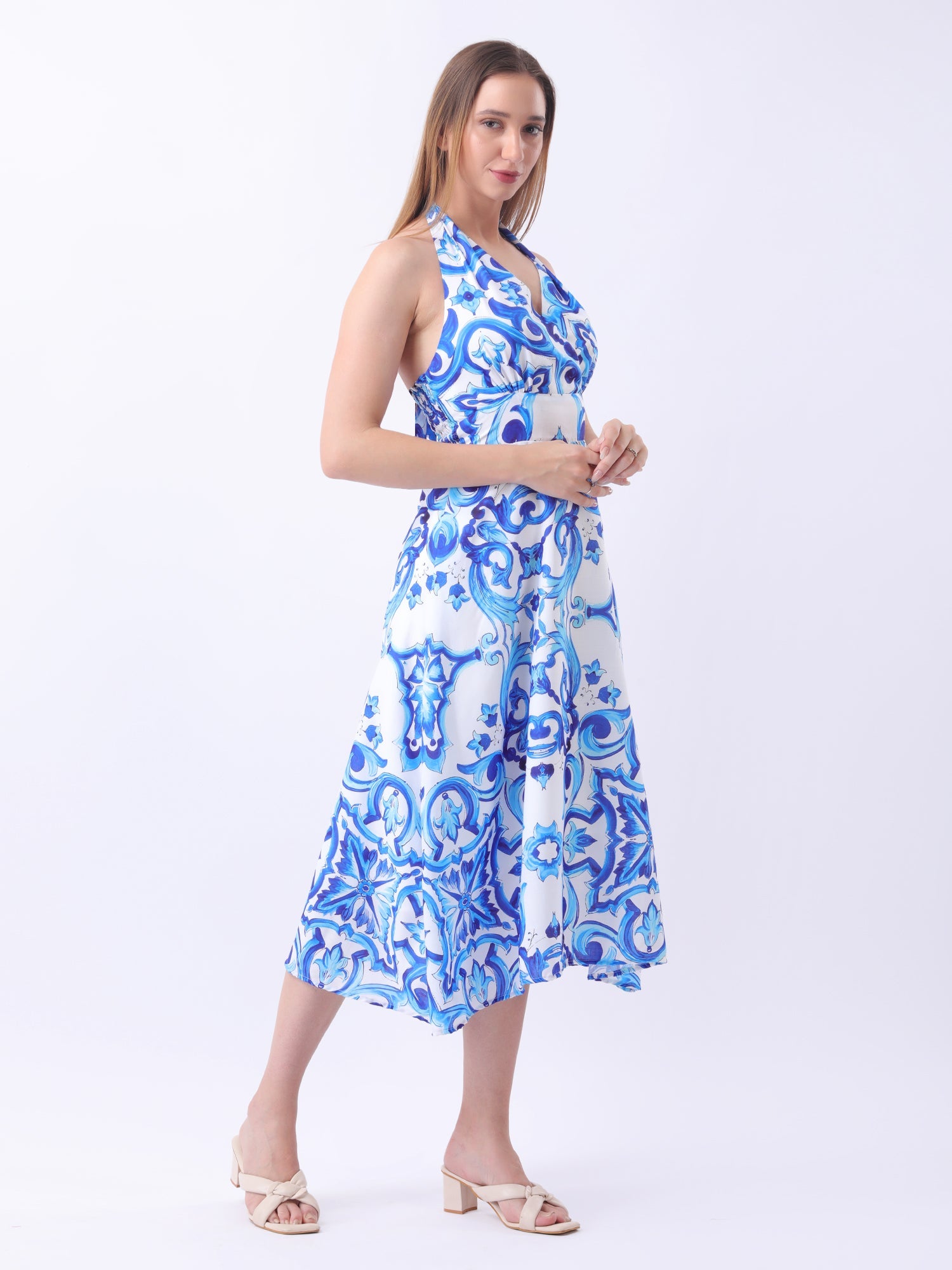 This Gaiia halter-neck printed midi dress captures a blend of sophistication and relaxed charm. The open-shoulder neckline frames the collarbone beautifully, while the fitted bodice and A-line skirt create a timeless shape. Detailed with an intricate print and practical pockets, it offers both elegance and ease, making it ideal for resort wear, brunches, or daytime celebrations. Crafted for the Gaiia woman, it is a perfect balance of refinement and comfort.