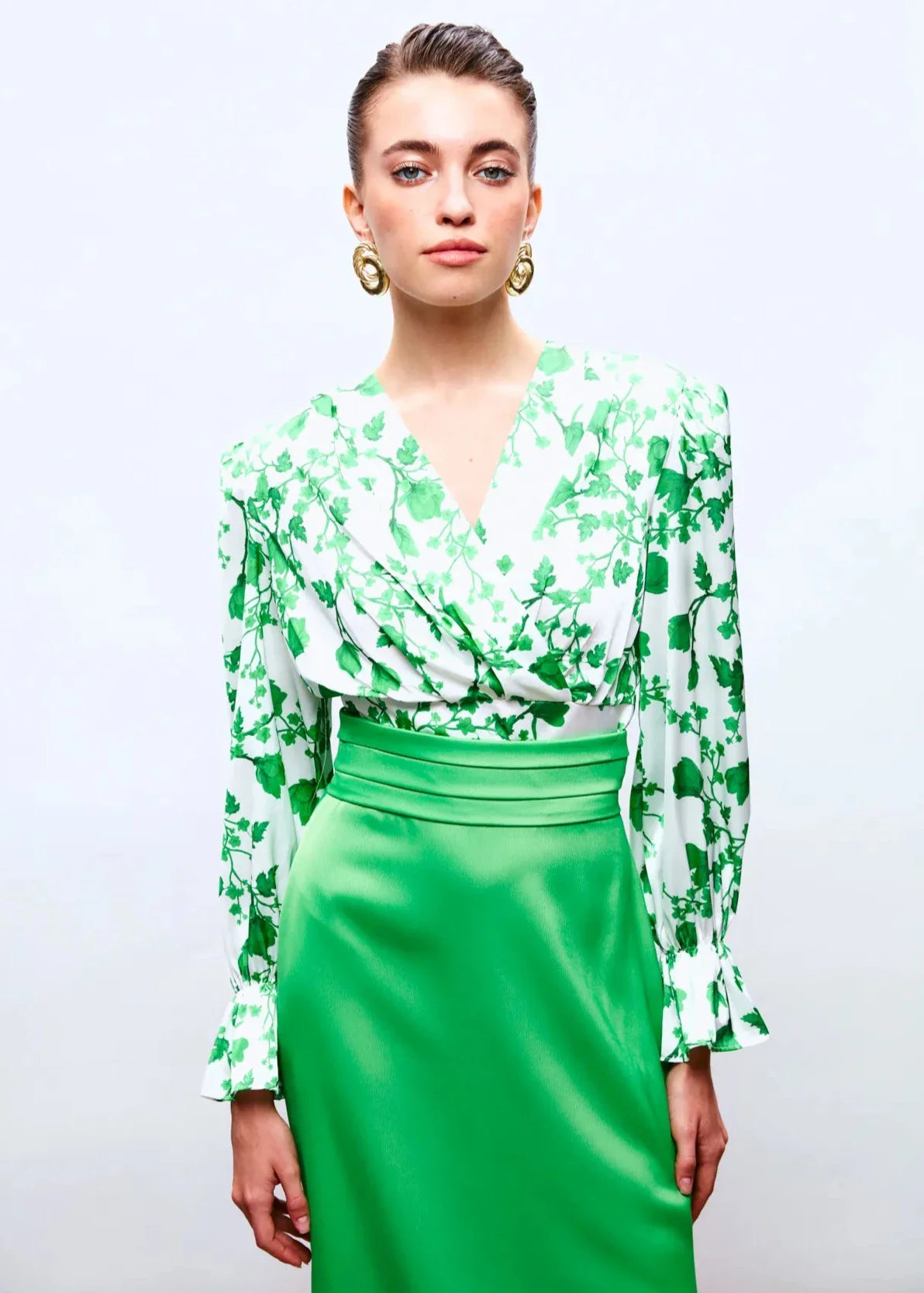 Gaiia Satin Printed Crop Top With Padded Shoulder - Green