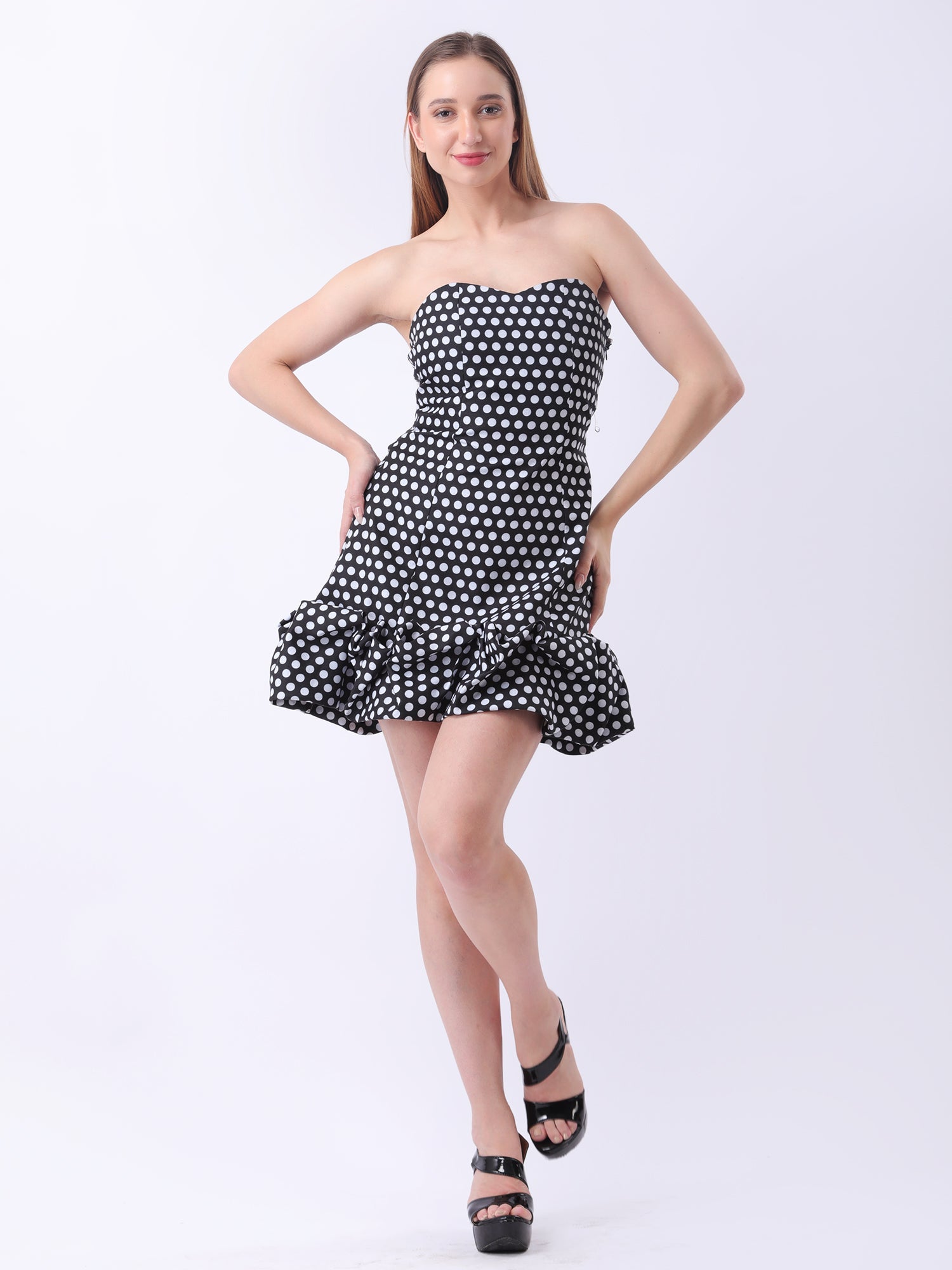 This strapless polka dot ruffle-hem mini dress blends retro charm with contemporary flair. The fitted bodice highlights the figure, while the flouncy ruffle hem adds dynamic movement and a playful finish. Perfect for daytime outings, date nights, or weekend parties, this dress delivers a chic yet fun statement that€™s effortlessly stylish and confidence-boosting.