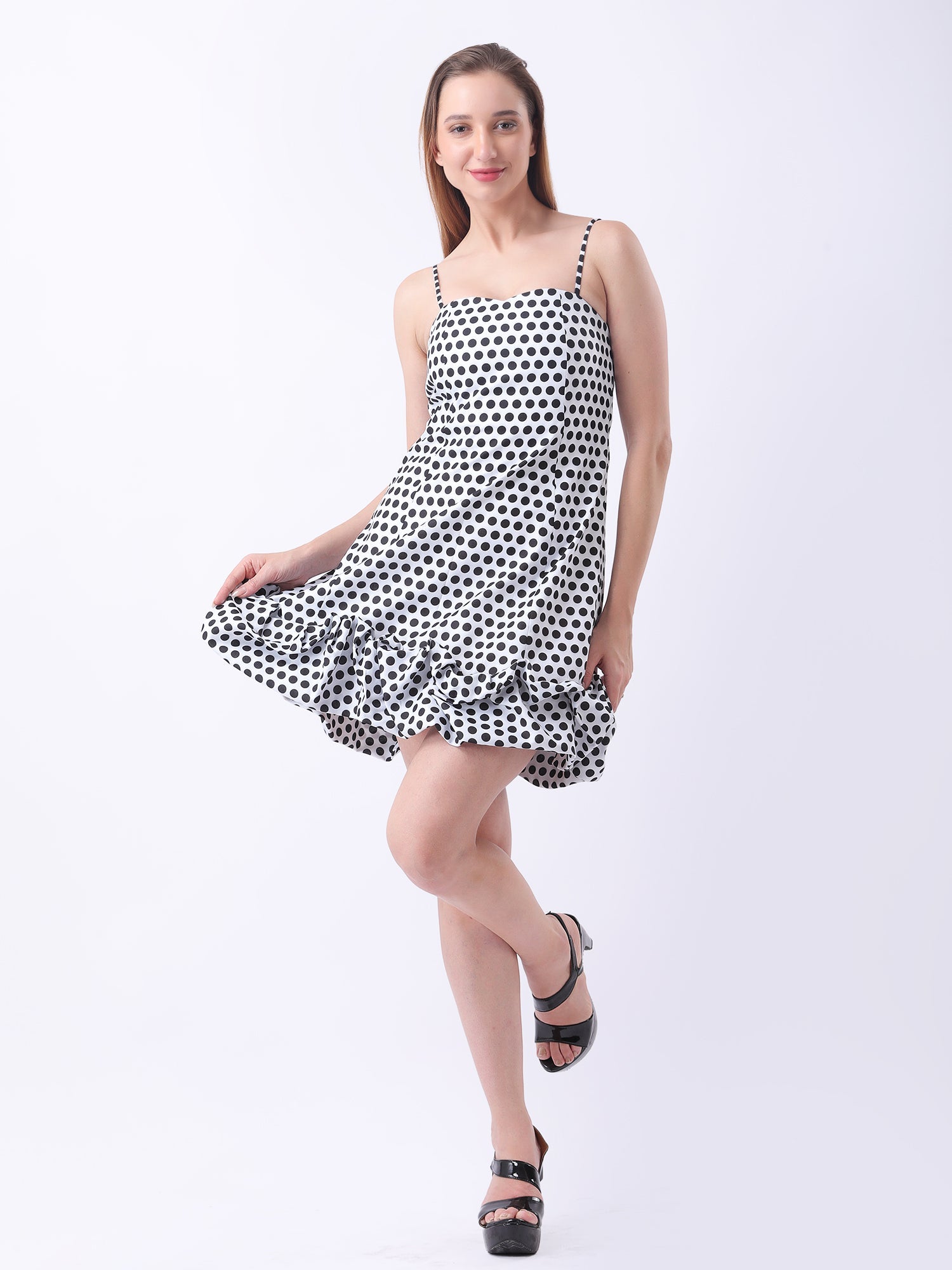 This strapless polka dot ruffle-hem mini dress blends retro charm with contemporary flair. The fitted bodice highlights the figure, while the flouncy ruffle hem adds dynamic movement and a playful finish. Perfect for daytime outings, date nights, or weekend parties, this dress delivers a chic yet fun statement that€™s effortlessly stylish and confidence-boosting.
