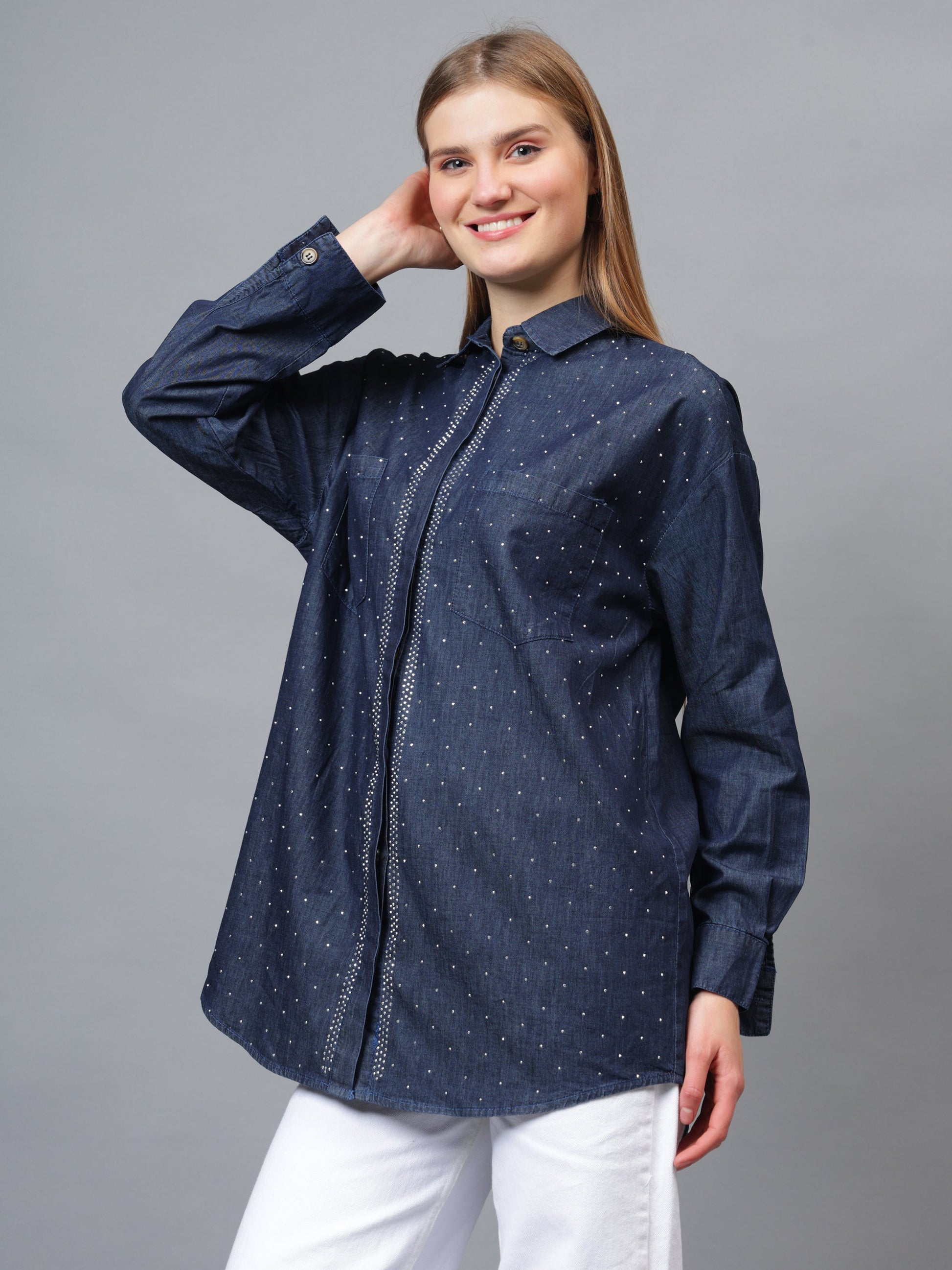 Elevate your style with the Swaroski Studded Blue Denim Shirt. The iconic denim shirt is given a touch of glam with sparkling Swaroski crystals, adding a hint of luxury to any outfit. Perfect for both casual and dressy occasions, this shirt will make a statement and elevate your wardrobe.Upgrade your denim look with our Swaroski studded blue denim shirt. The perfect mix of style and comfort, this shirt will add a touch of luxury to any outfit. The dazzling studded design will make you stand out and shine in any crowd. Upgrade your wardrobe with this must-have piece today!