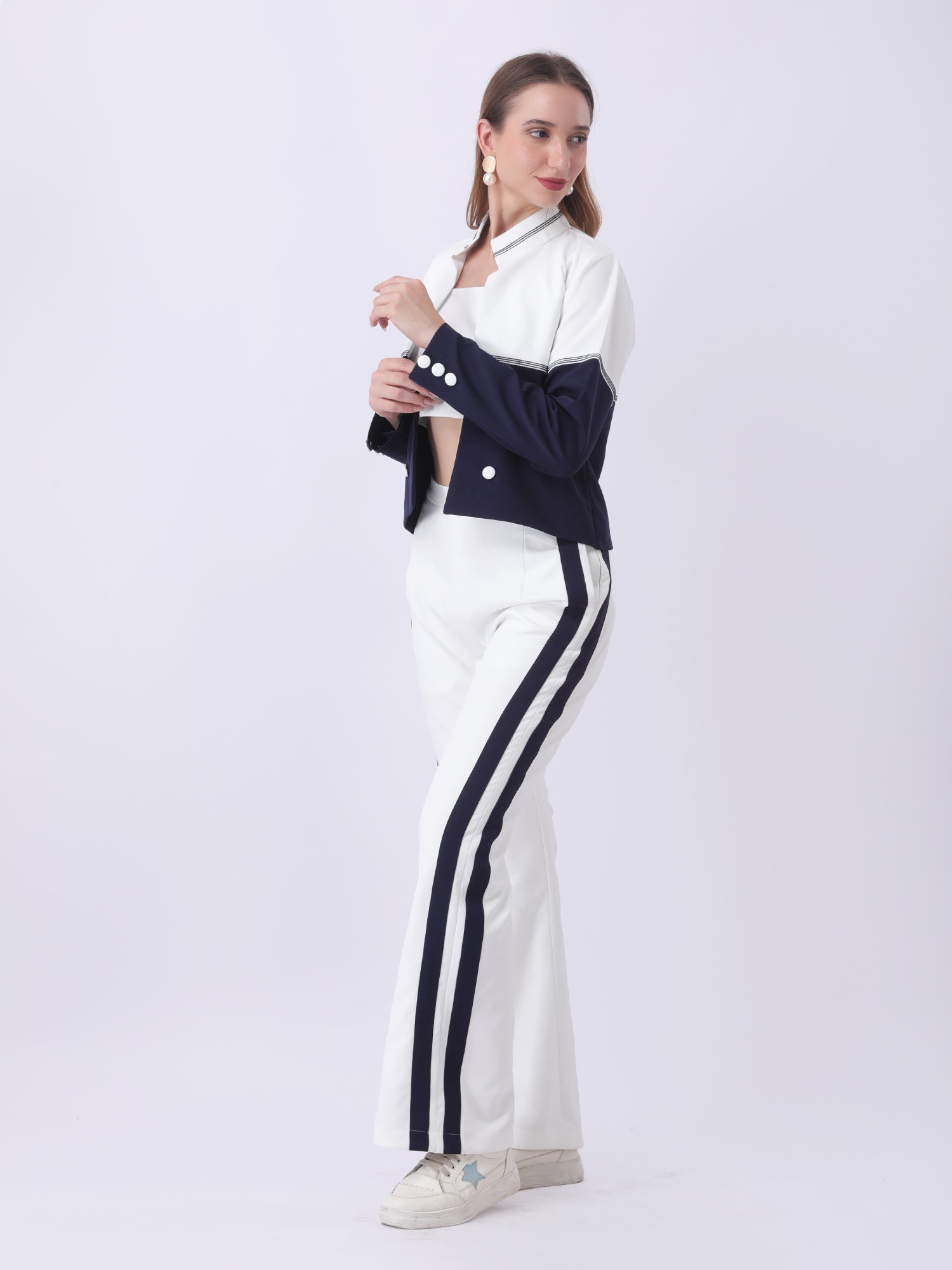 The Gaiia white navy color-block co-ord set is a fresh, statement athleisure look. Featuring a cropped jacket with striking navy contrast, a matching fitted crop top, and wide-leg trousers with sleek side stripes, this outfit offers a perfect blend of style and comfort. Ideal for travel, casual outings, or modern streetwear, it pairs effortlessly with sneakers for a polished yet relaxed vibe.