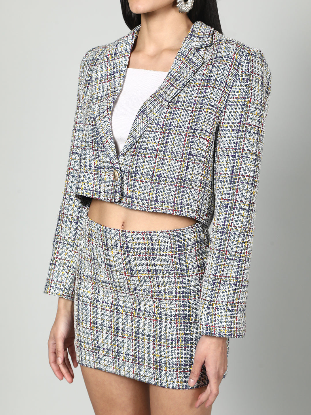 Elevate your fashion game with our Tweed Checkered Blazer And Miniskirt Set. The classic tweed design adds a touch of elegance to your wardrobe, while the matching blazer and miniskirt make it versatile for any occasion. This set is a must-have for your stylish and chic look.The tweed design adds a touch of elegance to your wardrobe, while the matching blazer and miniskirt provide endless styling options for any occasion. It's a stylish and versatile set that will elevate your fashion game.