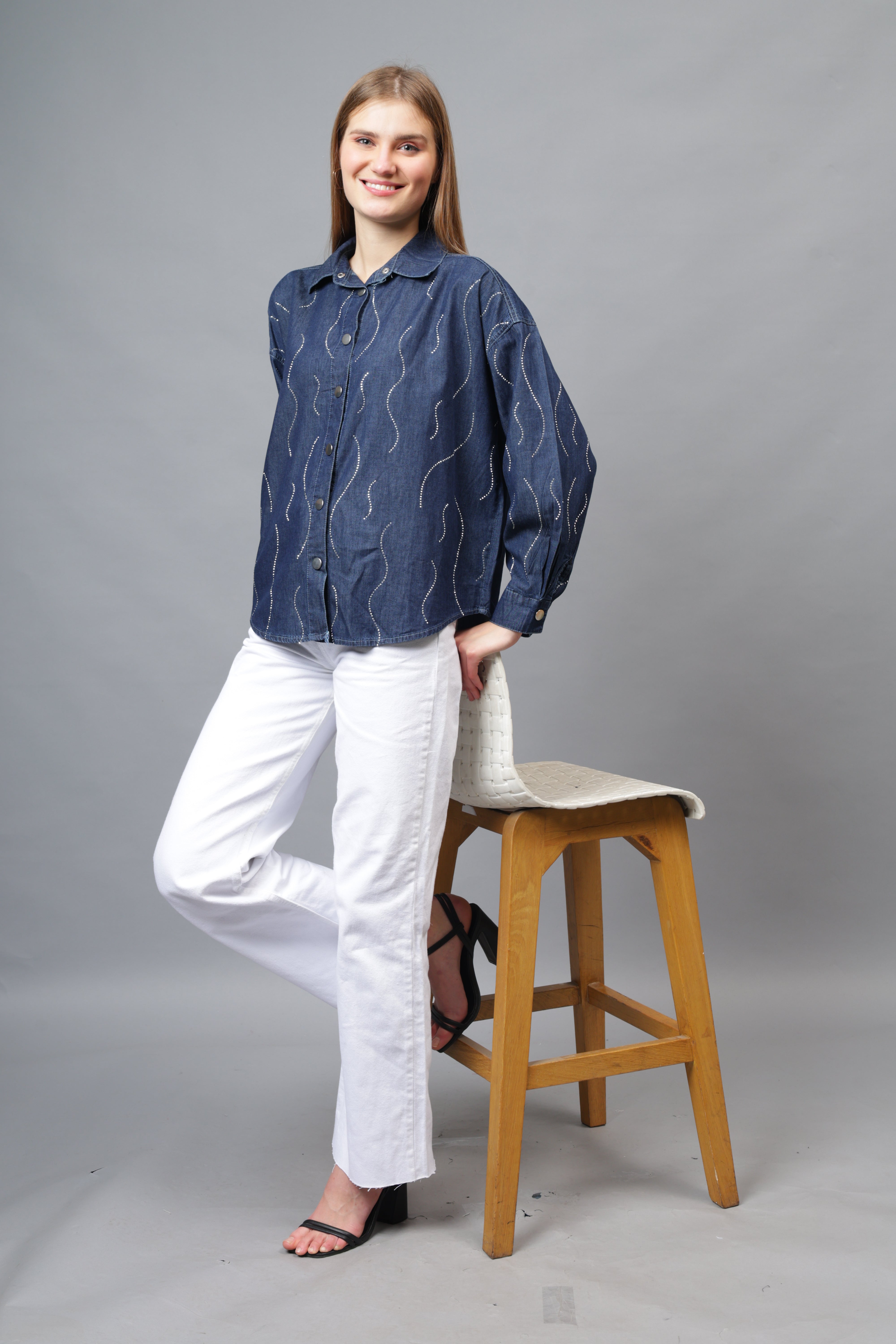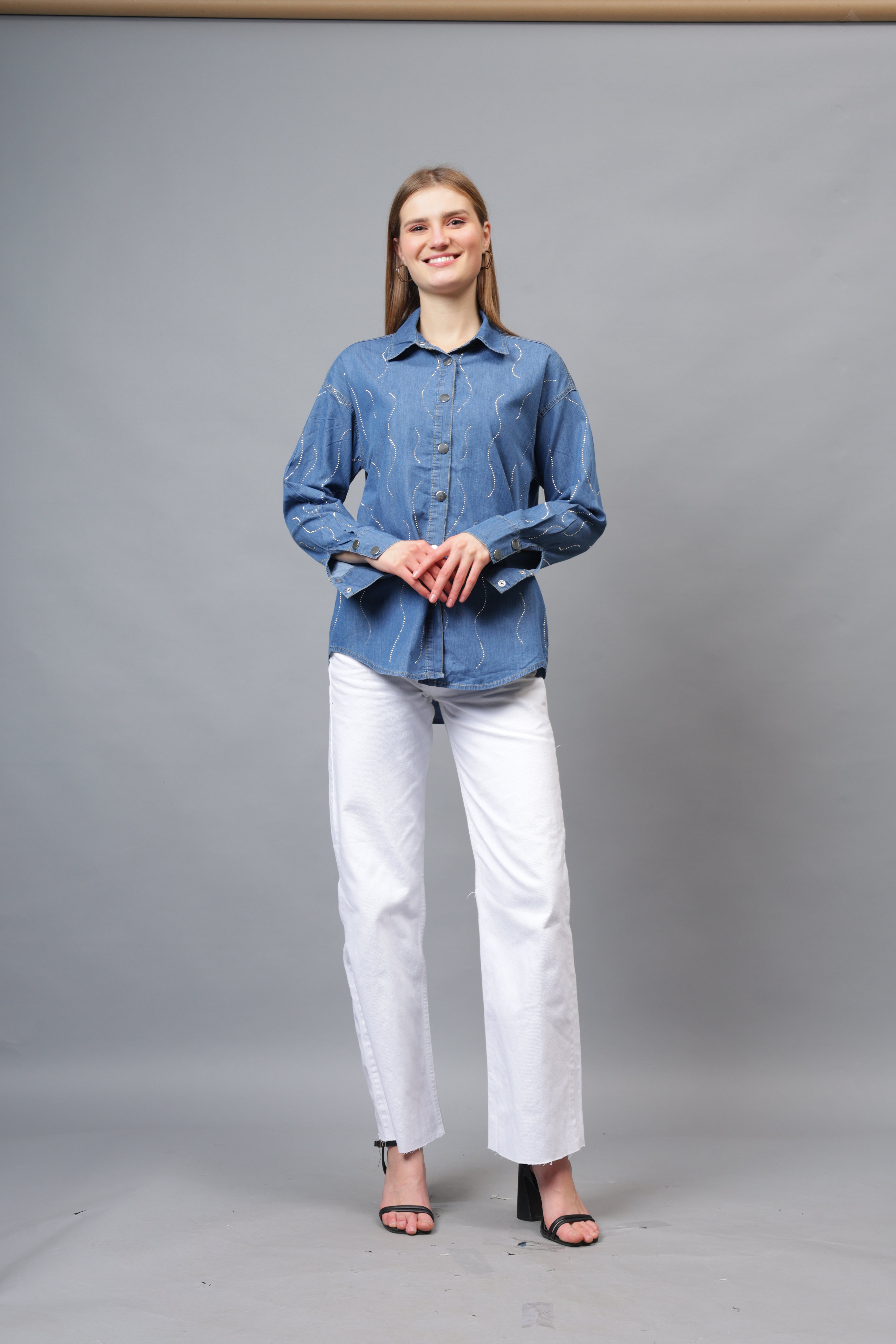 Introducing the Wavy Shimmer Denim Shirt - the perfect blend of style and comfort! Its unique wavy shimmer design adds a touch of elegance to your casual look. Crafted with soft and durable denim, this shirt is sure to keep you looking and feeling great all day long.