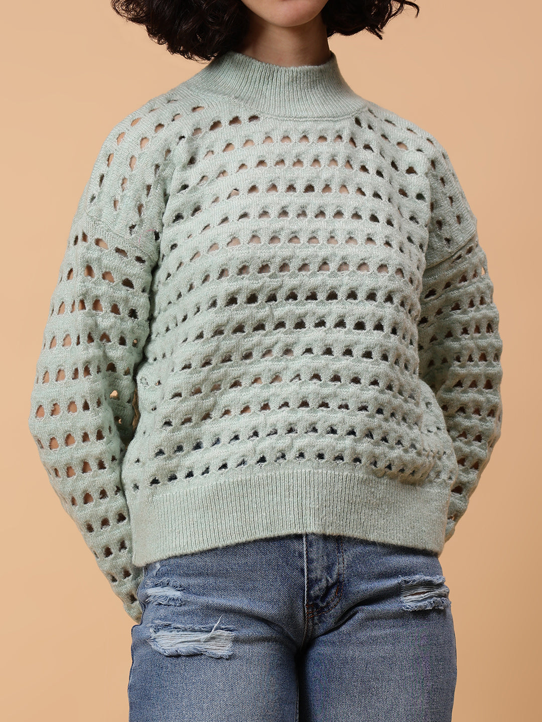 Elevate your fashion game with our Women Solid Regular Fit Cutwork Pullover. Made with delicate cutwork detailing, this pullover effortlessly combines style and comfort. Keep it casual or dress it up, this versatile piece will be a staple in your wardrobe. Shop now and elevate your everyday look.The delicate cutwork design adds a touch of elegance to this regular-fit pullover. Stay stylish and comfortable all day long.