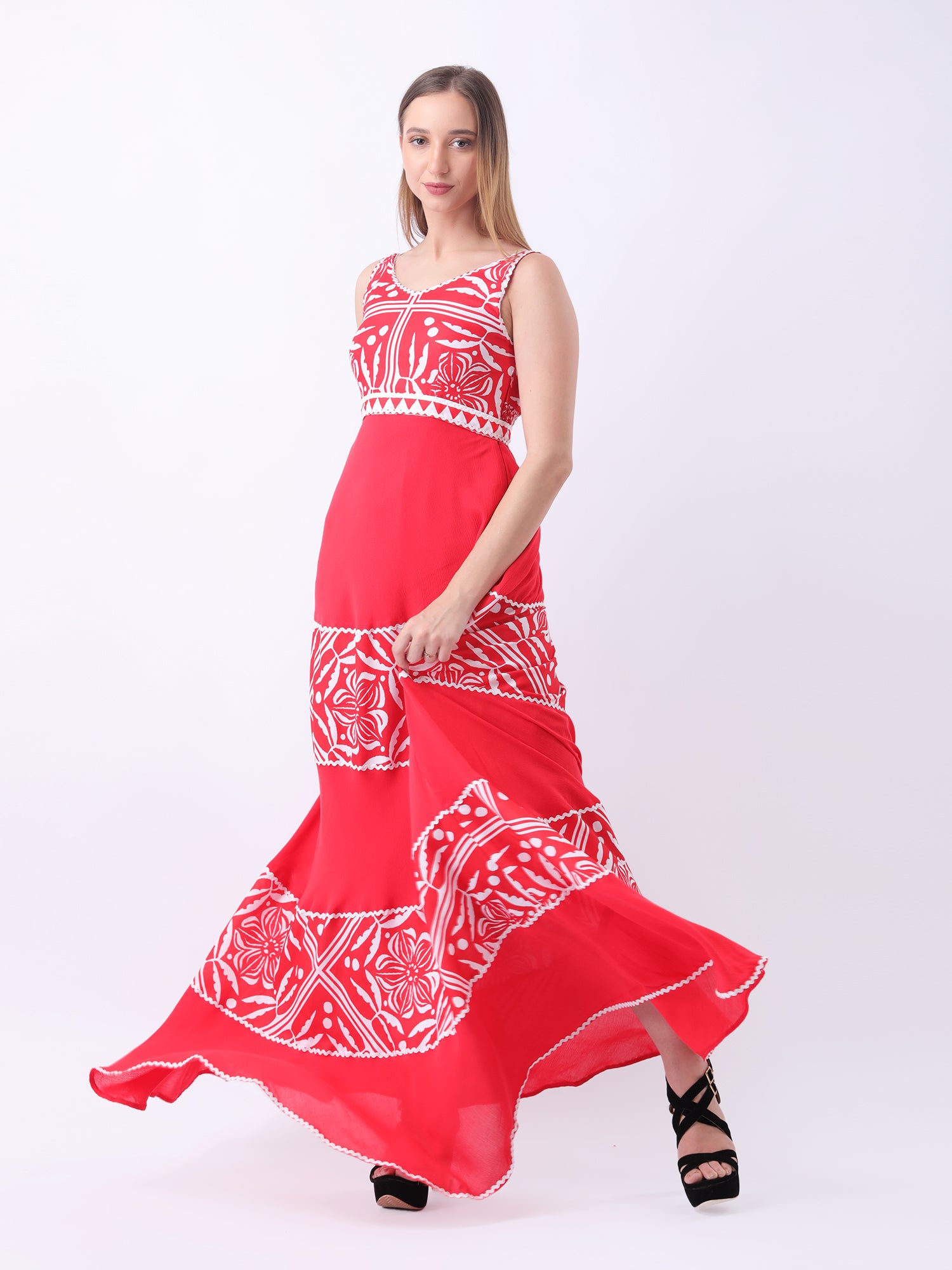 A signature Gaiia creation, this sleeveless maxi dress blends a streamlined silhouette with bold pattern placement. The fitted bodice and defined waistband sculpt the figure, while the tiered skirt flows elegantly with each step. The intricate patterned panels add an artisanal touch, making this piece perfect for resort wear, outdoor gatherings, or sophisticated daytime events. Designed to embody ease and elegance, it reflects the effortless sophistication of the Gaiia woman.